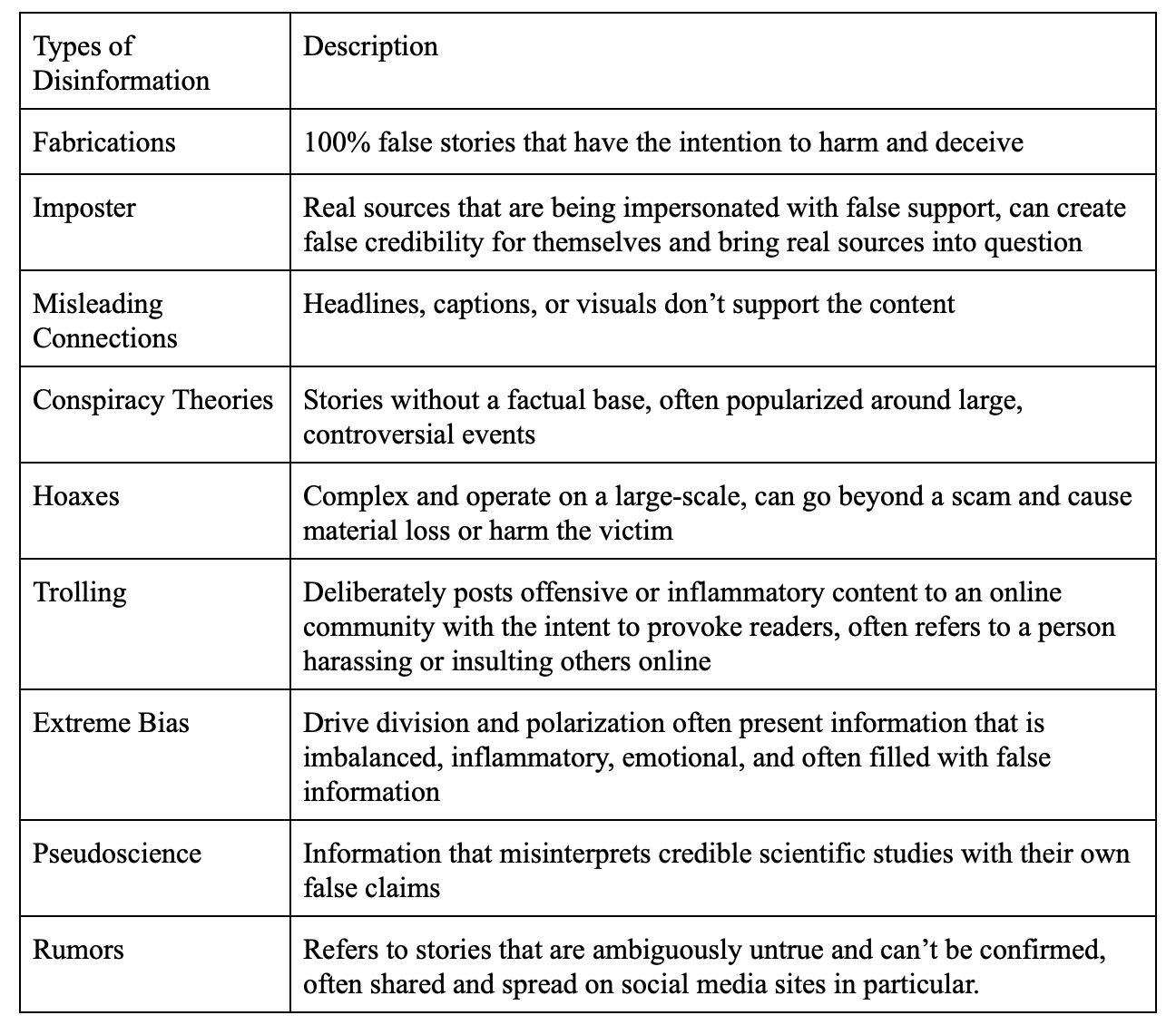 Disinformation is a large topic and there are many different types. Having a shared understanding of terms and definitions is essential as different disinformation terms may use different theoretical analysis. Some scholars identify as many as 11 categories of disinformation. In this blog we’ll be focusing on 9, as clickbait and fake reviews are often created and spread solely for profit and so are less useful for identifying trends. The remaining types include fabrications, imposters, misleading connections, conspiracy theories, hoaxes, trolling, biased, pseudoscience, and rumors. The following table outlines each type and its description.