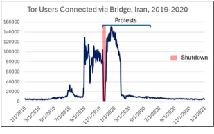 While there are some exceptions, such as elevated use of the Tor network in the early fall of 2019, the number of bridge-connecting users during Bloody November was highly anomalous. Unlike previous upticks in Tor usage in Iran, the Bloody November protests saw consistent Tor bridge activity sustained at high levels for over two months. The peak in the data coupled with the increase in Tor use as the protests intensified and the decrease as they ended suggests that the bridge use was directly correlated with the protests. Organizing, discussing, and attending the Bloody November protests appears to be associated with increased Tor activity. This supports the conclusion of prior research that the attempts at political expression in highly repressive regimes often correspond with increases in dark web use.[24]