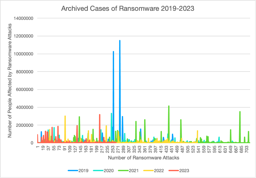 In our data, from the U.S. Department of Health and Services archives, we were able to gather that in 2019 we had the most people affected by ransomware attacks.[18] This date is significant since that was the start of the Covid-19 pandemic and lots of unknowns were at play. Most of the world and most countries have not experienced mass ransomware attacks that attacked infrastructure or the medical sector. These cases were especially targeted to the medical sector in which the people affected had medical records stolen or were held hostage without their knowledge. These cases led to massive reform in governments and the talks of ransomware prevention that we mentioned earlier in the blog. We can also notice that 2021 had the biggest surge in the number of archived cases of ransomware. This data was in conjunction with more than 500 million ransomware attacks that happened in the first half of 2021. This data also shows an overwhelming increase in ransomware attacks between the years 2020 and 2021.[19] The data shows a massive decrease in the number of ransomware attacks in the year 2023. This can be heavily contributed to the leaps in efforts made to combat ransomware attacks and the awareness that countries, governments, and entities had to detect and prevent their data from getting leaked. Of the two spikes in 2019, we were able to see that these two spikes were exclusively targeted at big insurance companies that are in the medical sector.