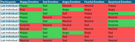 The primary testing goal of the research protocol was for each facial recognition program (Vladmandic and Visage SDK) to successfully detect the emotion expressed by the volunteer lab participant. Both Vladmandic and Visage SDK display probabilities (as percentages) of likeliness for the expression to portray a particular emotion; in other words, if a participant were to show a happy face, either program could, for example, display 67% Happy, 23% Surprised, and 10% Neutral. In that case, happiness would be the emotion detected as it had the highest probability of detection, and that would lead to a successful match between the program and the participant. Each facial expression was held by the participant for 5 to 10 seconds which was timed on a standard analog wristwatch. There were five emotions that were tested, those being: Happiness, Sadness, Anger, Fear, and Surprise. Every lab volunteer in this protocol experiment signed a consent form prior to any experimentation taking place. After that, the demographics and any other physical traits were recorded from the participants in an excel sheet. These demographics included age, sex race, hair color, hair length (with the options either being short, medium, or long), facial hair, glasses, makeup, hat, and contacts. All would be factors that could potentially skew the results of the testing and demonstrate that there are biases or inaccuracies in facial recognition programs.